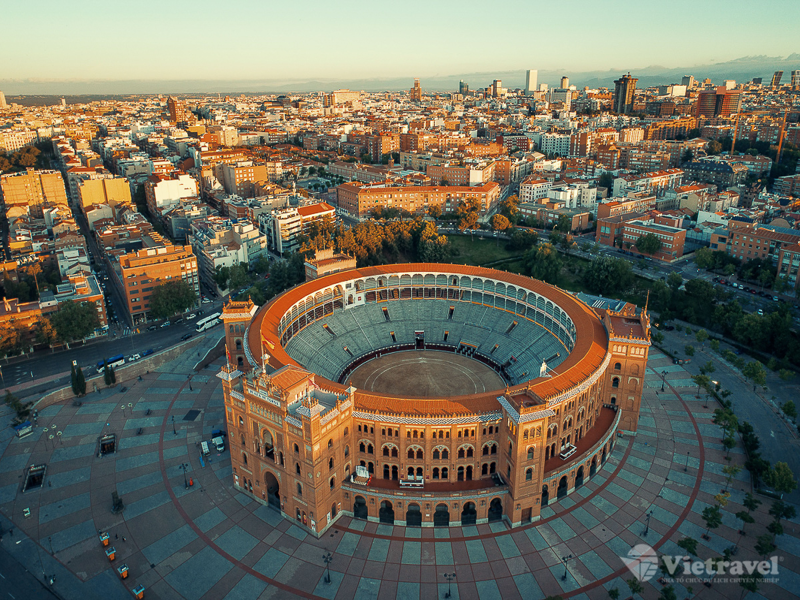 Đoàn ghé chụp hình: đài phun nước Cibeles, Plaza de Colón với lá cờ lớn, trường đấu bò Las Ventas.