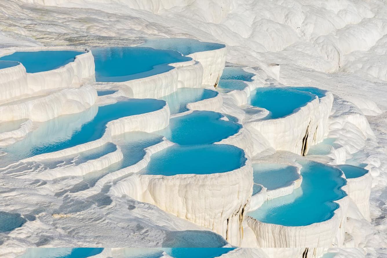 Nếu đã quá quen thuộc với những cái tên như Istanbul hay Cappadocia, hãy tìm đến “Lâu đài bông” Pamukkale để chiêm ngưỡng vẻ đẹp ngoạn mục có một không hai. Nhìn từ xa, Pamukkale trông như một khối sợi bông màu trắng khổng lồ xếp chồng lên nhau. Khi đến gần, bạn sẽ thấy những hồ nước khoáng nóng màu xanh lục bảo ảo diệu bên trong những hốc đá vôi trắng toát, đủ sức để khiến mọi bức hình trở nên hoàn hảo. Sẽ rất tuyệt vời khi ngắm hoàng hôn Pamukkale. Màu sắc nền trời cam, vàng, tím hòa cùng màu trắng của lớp đá vôi, sẽ khiến bạn choáng ngợp trước vẻ đẹp vừa quyến rũ vừa yên bình nơi đây.